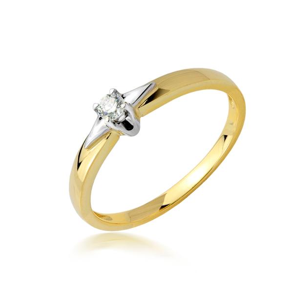 Centralnym punktem pierścionka jest starannie osadzony brylant o masie 0.062 ct, czystości SI2 oraz barwie H, który pięknie odbija światło i dodaje biżuterii blasku. Delikatna oprawa z białego złota podkreśla kamień, a smukła, żółta obrączka nadaje całości elegancji i lekkości.